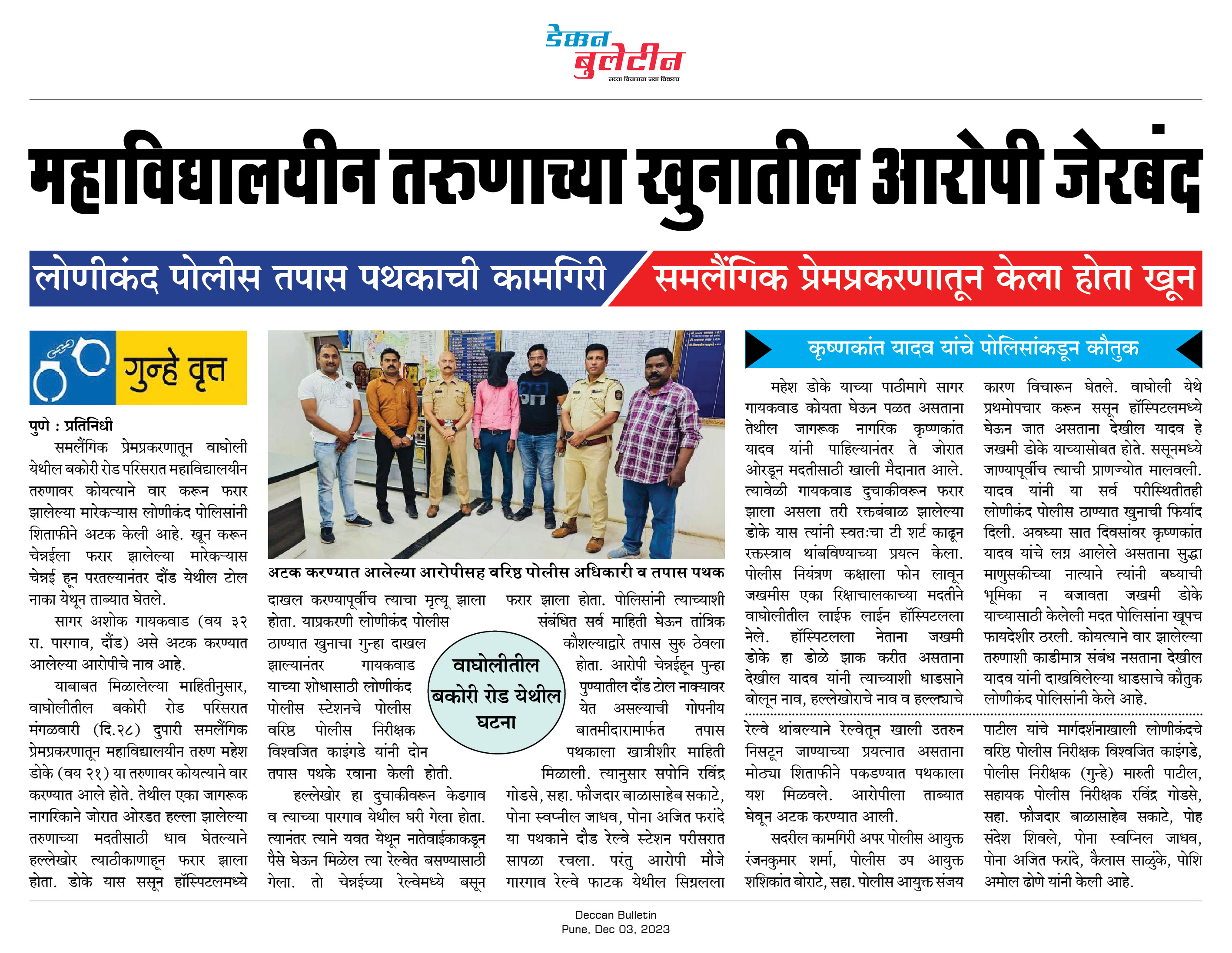 याबाबत मिळालेल्या माहितीनुसार, वाघोलीतील बकोरी रोड परिसरात मंगळवारी (दि.२८) दुपारी समलैंगिक प्रेमप्रकरणातून महाविद्यालयीन तरुण महेश डोके (वय २१) या तरुणावर कोयत्याने वार करण्यात आले होते. तेथील एका जागरूक नागरिकाने जोरात ओरडत हल्ला झालेल्या तरुणाच्या मदतीसाठी धाव घेतल्याने हल्लेखोर हा त्याठीकाणाहून फरार झाला होता. डोके यास ससून हॉस्पिटलमध्ये दाखल करण्यापूर्वीच त्याचा मृत्यू झाला होता. याप्रकरणी लोणीकंद पोलीस ठाण्यात खुनाचा गुन्हा दाखल झाल्यानंतर गायकवाड याच्या शोधासाठी लोणीकंद पोलीस स्टेशनचे पोलीस वरिष्ठ पोलीस निरीक्षक विश्वजित काइंगडे यांनी दोन तपास पथके रवाना केली होती.