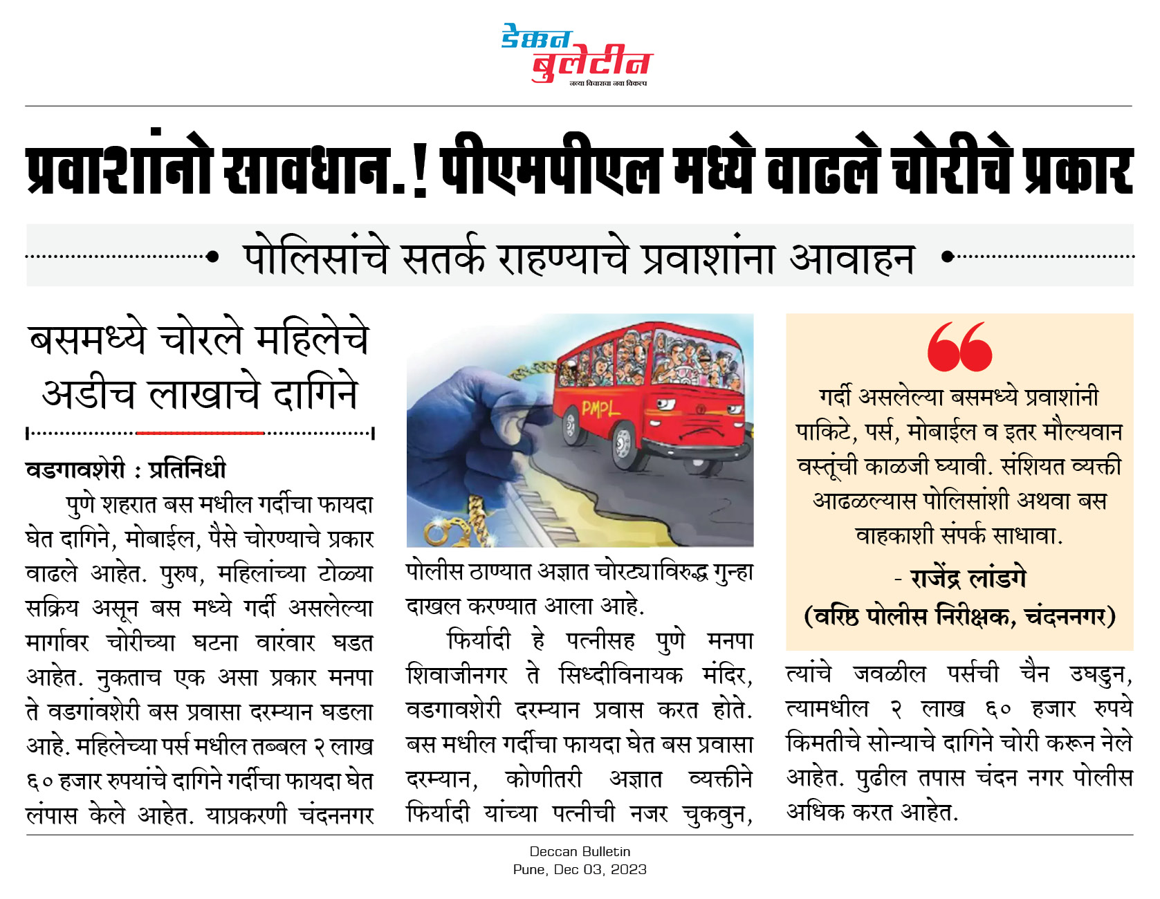 फिर्यादी हे पत्नीसह पुणे मनपा शिवाजीनगर ते सिध्दीविनायक मंदिर, वडगावशेरी दरम्यान प्रवास करत होते. बस मधील गर्दीचा फायदा घेत बस प्रवासा दरम्यान, कोणीतरी अज्ञात व्यक्तीने फिर्यादी यांच्या पत्नीची नजर चुकवुन, त्यांचे जवळील पर्सची चेन उघडुन, त्यामधील २ लाख ६० हजार रुपये किमतीचे सोन्याचे दागिने चोरी करून नेले आहेत. पुढील तपास चंदननगर पोलीस अधिक करत आहेत.
