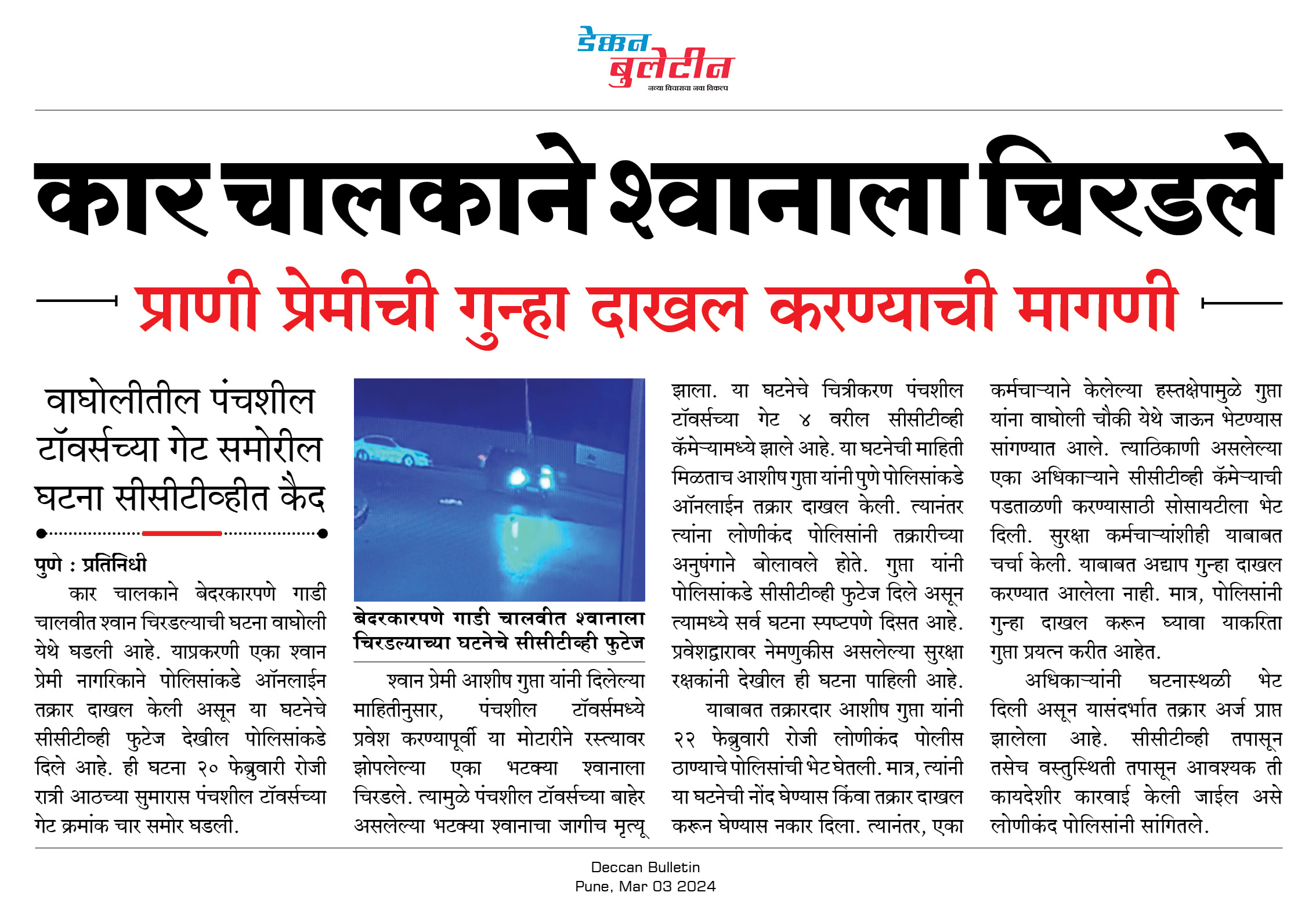श्वान प्रेमी आशीष गुप्ता यांनी दिलेल्या माहितीनुसार, पंचशील टॉवर्समध्ये प्रवेश करण्यापूर्वी या मोटारीने रस्त्यावर झोपलेल्या एका भटक्या श्वानाला चिरडले. त्यामुळे पंचशील टॉवर्सच्या बाहेर असलेल्या भटक्या श्वानाचा जागीच मृत्यू झाला. या घटनेचे चित्रीकरण पंचशील टॉवर्सच्या गेट ४ वरील सीसीटीव्ही कॅमेऱ्यामध्ये झाले आहे. या घटनेची माहिती मिळताच आशीष गुप्ता यांनी पुणे पोलिसांकडे ऑनलाईन तक्रार दाखल केली. त्यानंतर त्यांना लोणीकंद पोलिसांनी तक्रारीच्या अनुषंगाने बोलावले होते. गुप्ता यांनी पोलिसांकडे सीसीटीव्ही फुटेज दिले असून त्यामध्ये सर्व घटना स्पष्टपणे दिसत आहे. प्रवेशद्वारावर नेमणुकीस असलेल्या सुरक्षा रक्षकांनी देखील ही घटना पाहिली आहे.