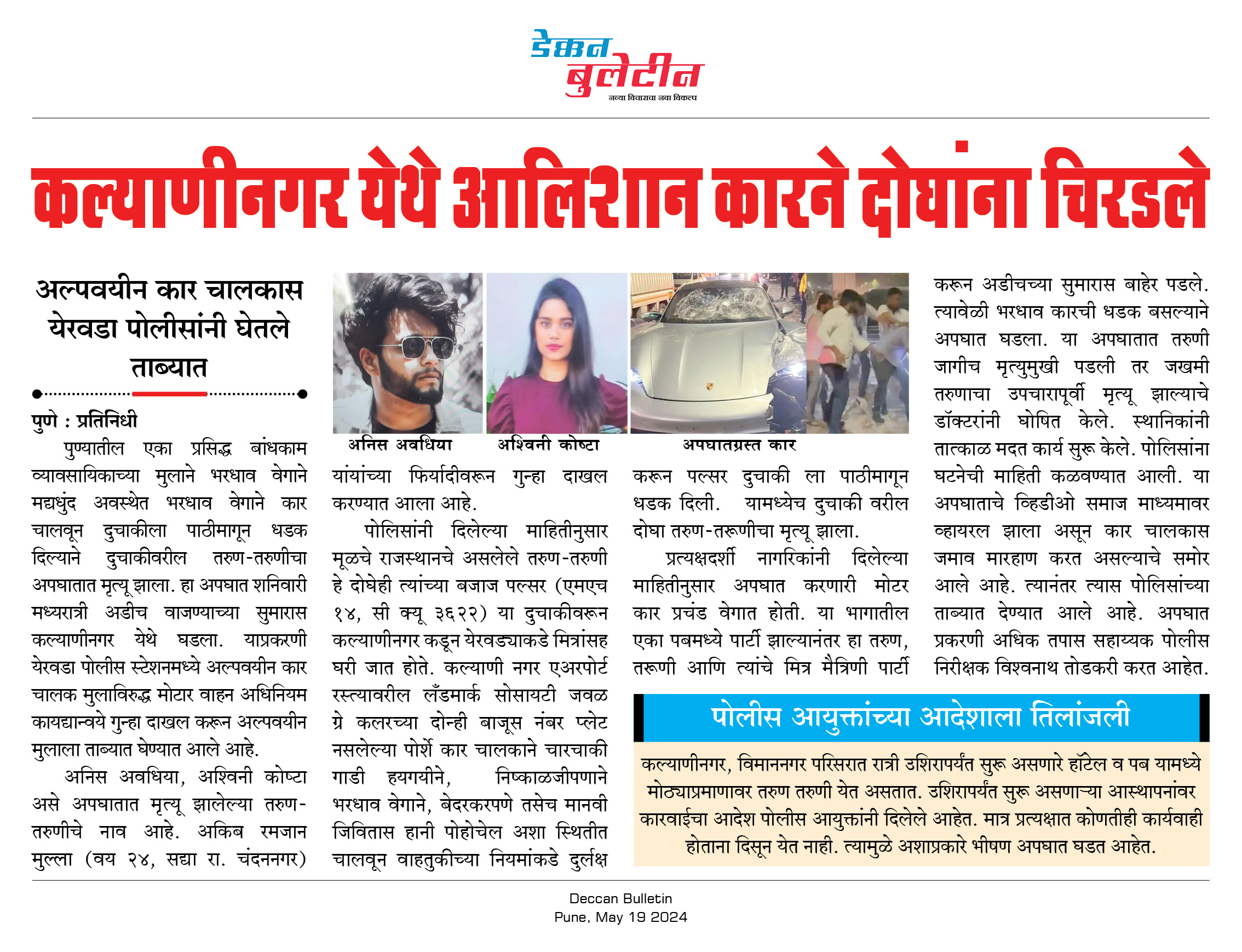 कल्याणीनगर, विमाननगर परिसरात रात्री उशिरापर्यंत सुरू असणारे हॉटेल व पब यामध्ये मोठ्याप्रमाणावर तरुण तरुणी येत असतात. उशिरापर्यंत सुरू असणाऱ्या आस्थापनांवर कारवाईचा आदेश पोलीस आयुक्तांनी दिलेले आहेत. मात्र प्रत्यक्षात कोणतीही कार्यवाही होताना दिसून येत नाही. त्यामुळे अशाप्रकारे भीषण अपघात घडत आहेत.