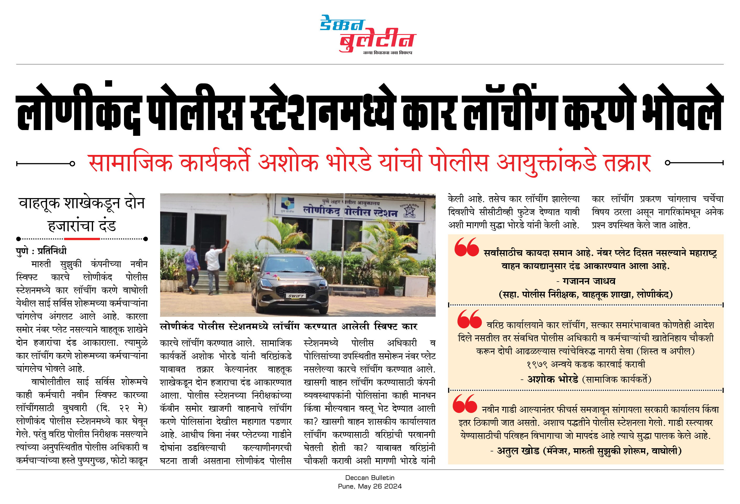 नवीन गाडी आल्यानंतर फीचर्स समजावून सांगायला सरकारी कार्यालय किंवा इतर ठिकाणी जात असतो. अशाच पद्धतीने पोलीस स्टेशनला गेलो. गाडी रस्त्यावर येण्यासाठीची परिवहन विभागाचा जो मापदंड आहे त्याचे सुद्धा पालक केले आहे. – अतुल खोड (मॅनेजर, मारुती सुझुकी शोरूम, वाघोली)