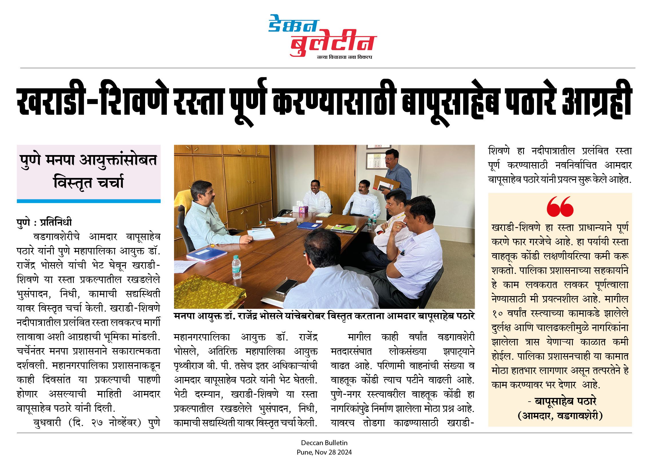 बुधवारी (दि. २७ नोव्हेंबर) पुणे महानगरपालिका आयुक्त डॉ. राजेंद्र भोसले, अतिरिक्त महापालिका आयुक्त पृथ्वीराज बी. पी. तसेच इतर अधिकाऱ्यांची आमदार बापूसाहेब पठारे यांनी भेट घेतली. भेटी दरम्यान, खराडी-शिवणे या रस्ता प्रकल्पातील रखडलेले भुसंपादन, निधी, कामाची सद्यस्थिती यावर विस्तृत चर्चा केली.